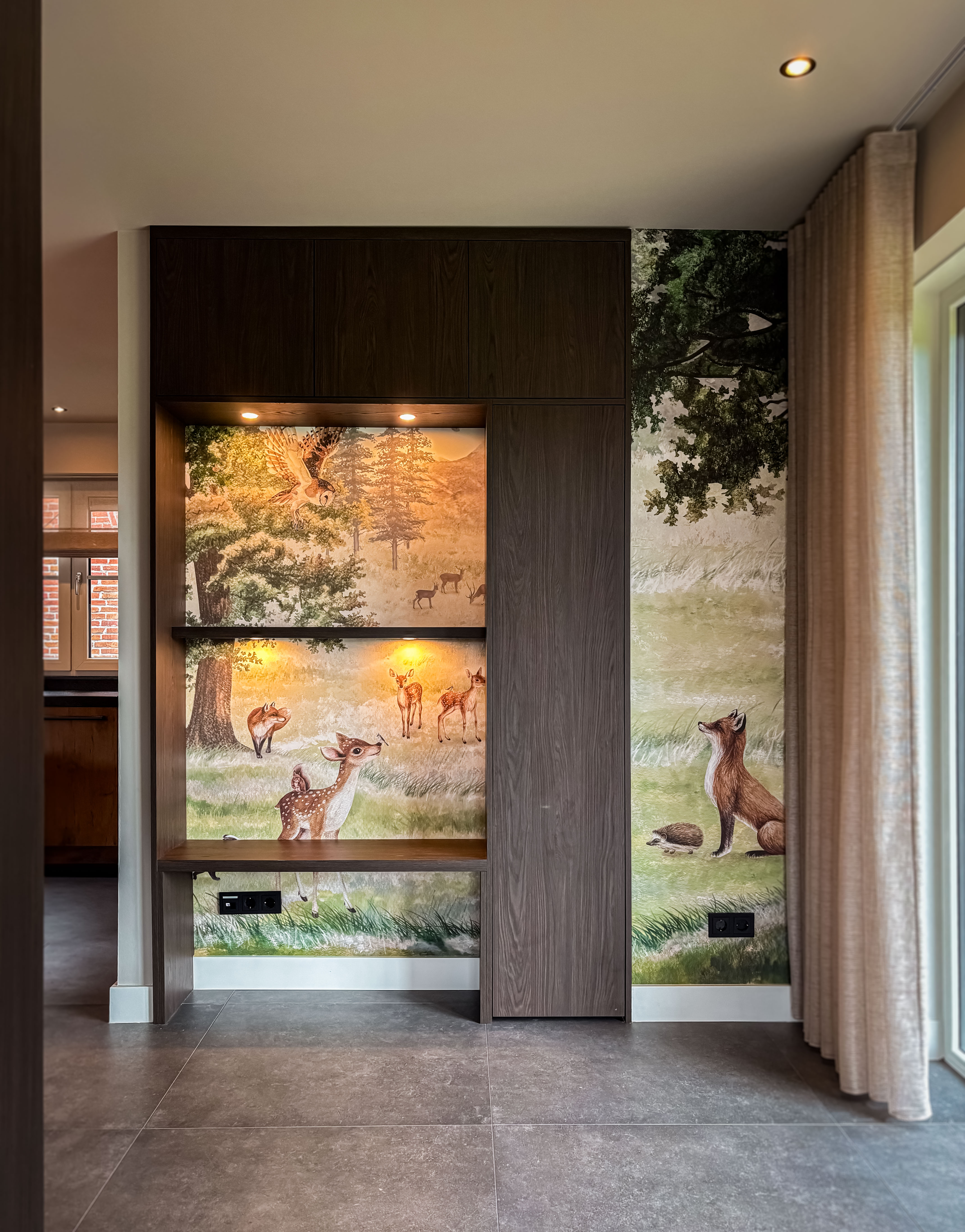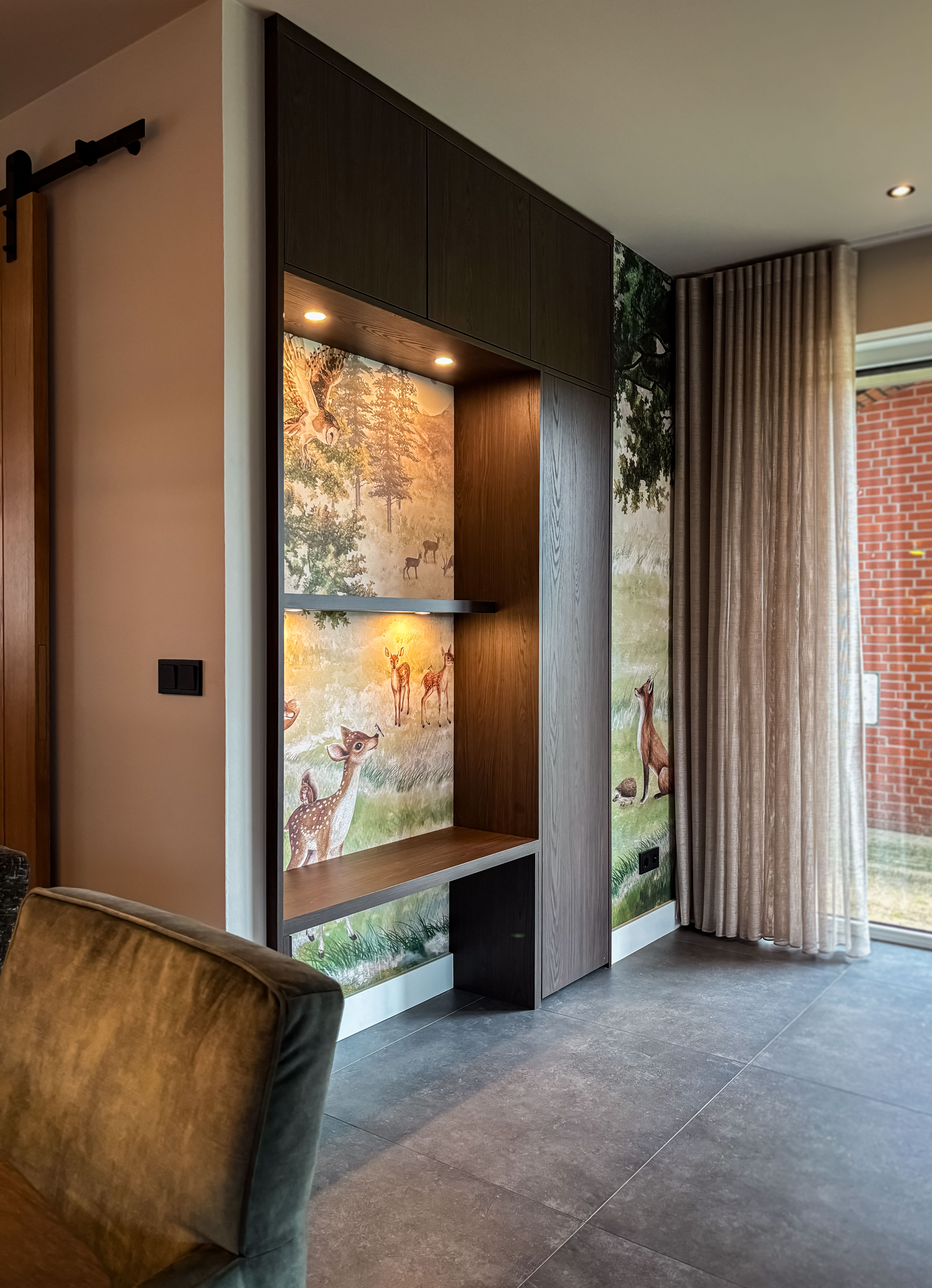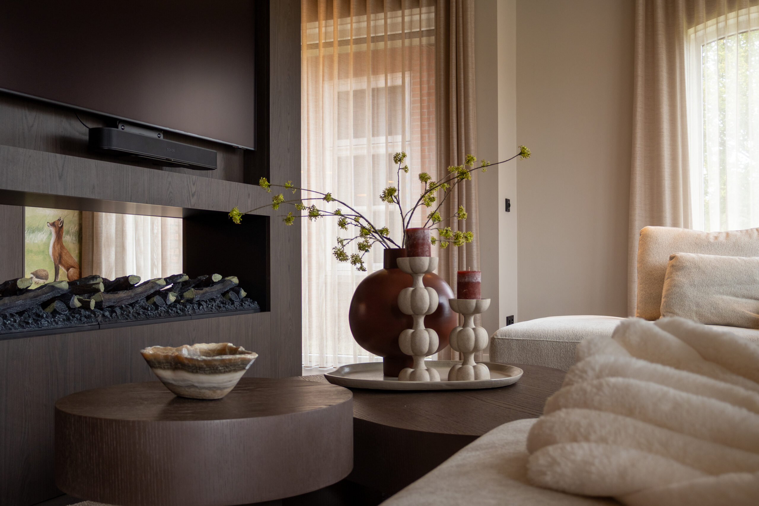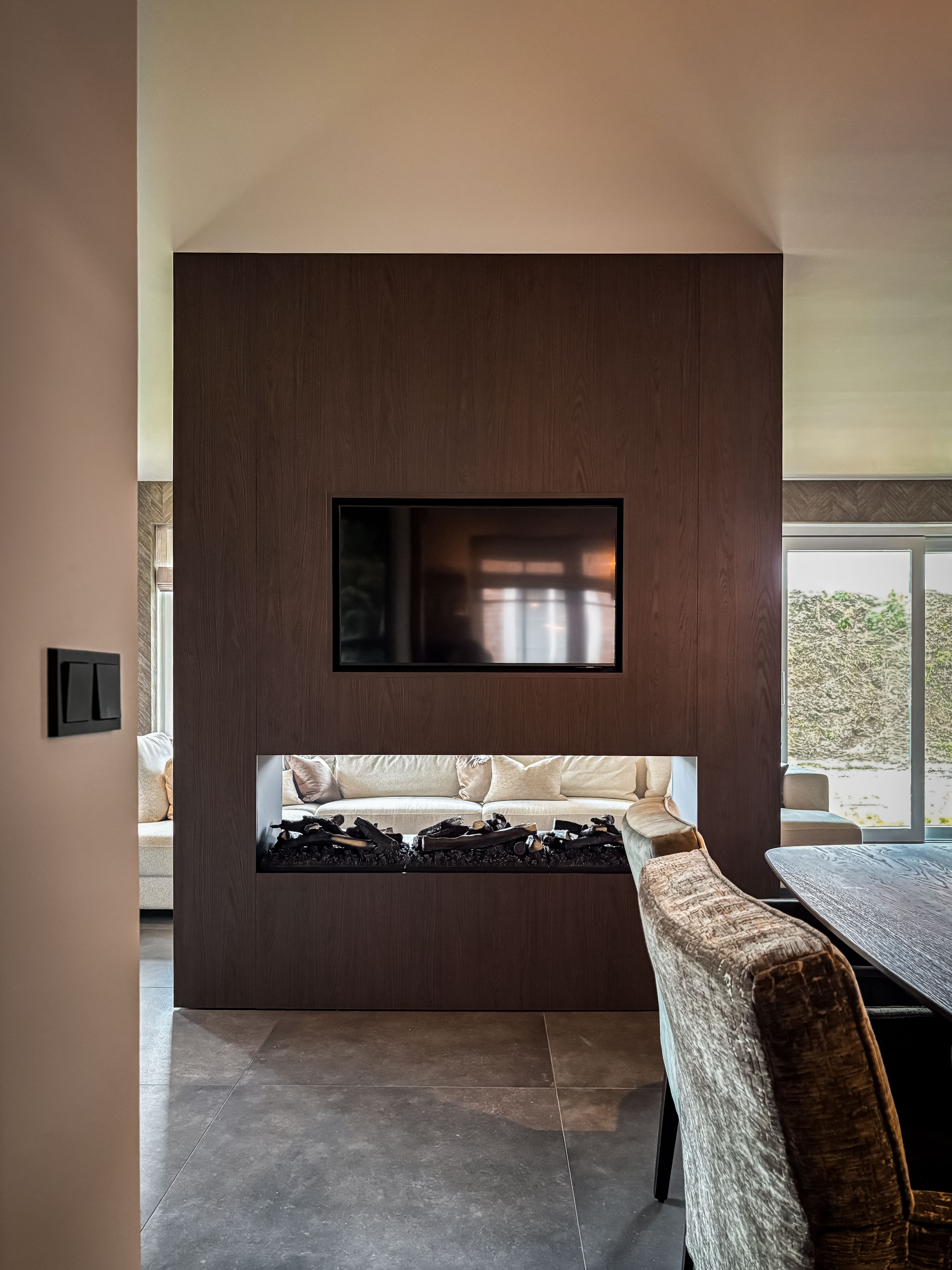 Voor een jong gezin in Tilligte mocht ik een interieurontwerp maken in een hotel chique stijl met een vleugje Japandi. De bewoners liepen in eerste instantie aan tegen de grote, open ruimte en wisten niet goed hoe deze optimaal in te delen.Na het uitwerken van meerdere 2D-indelingsopties werden ze enthousiast over het ontwerp met een roomdivider. Deze verdeelt de ruimte op een natuurlijke manier in twee sfeervolle leefgedeeltes, terwijl de haard in de roomdivider juist zorgt voor warmte en verbinding tussen beide zones.
